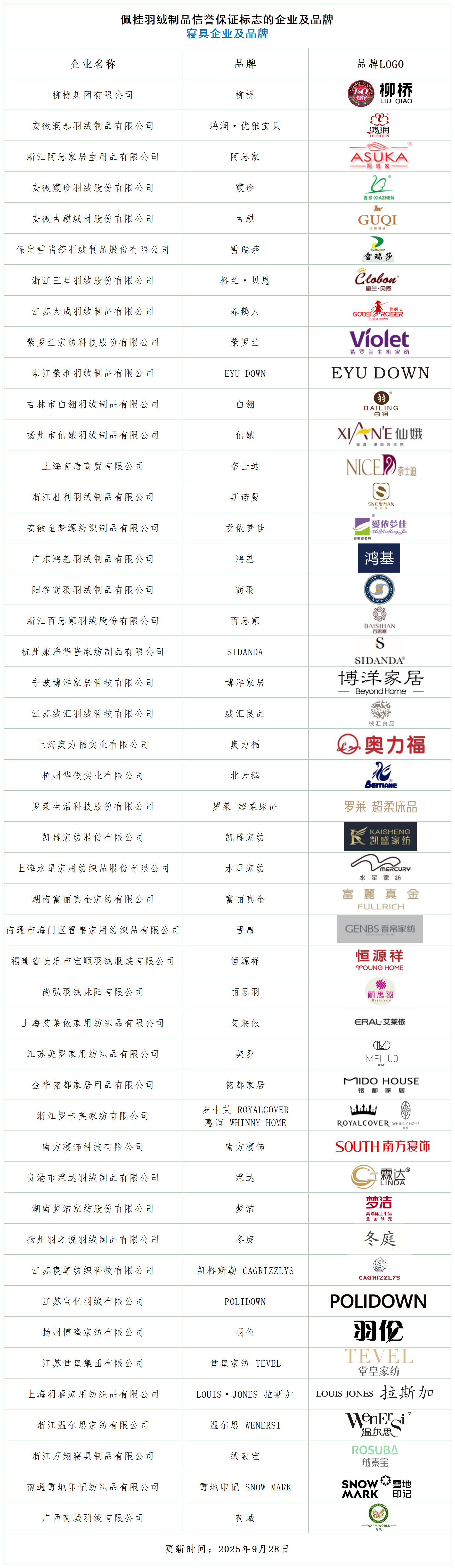 羽绒制品信誉保证标志佩挂企业及品牌(寝具)