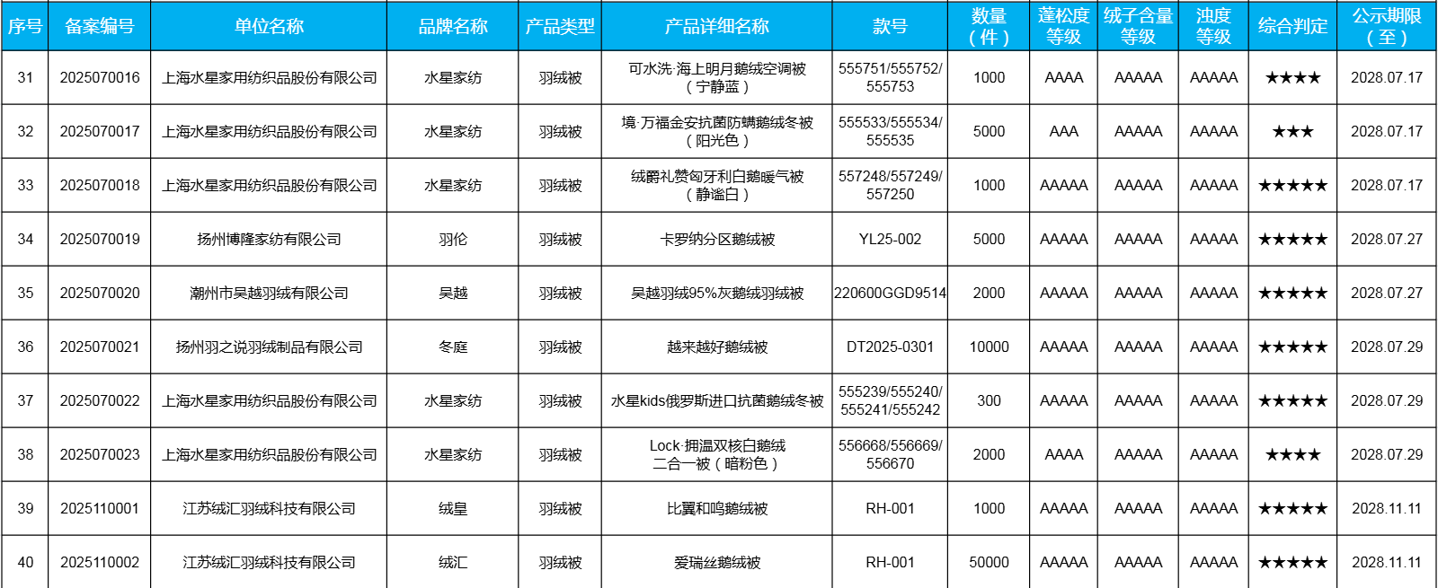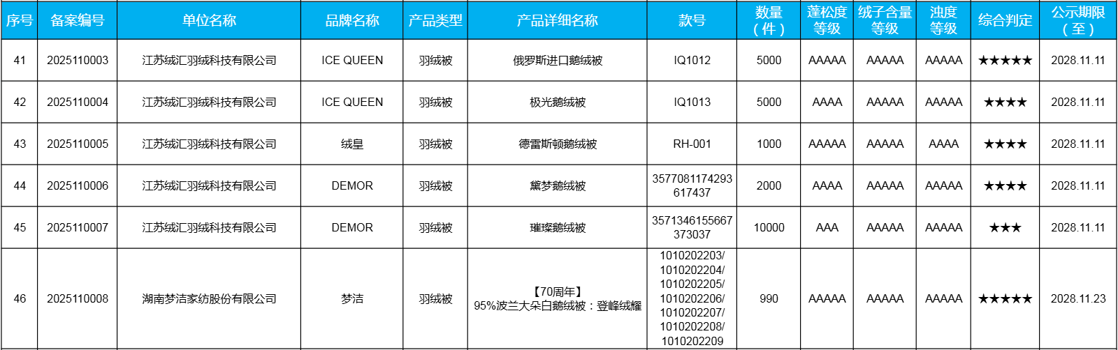 为了向消费者统一推荐采标的优质产品,向总局实时汇报项目工作进展,该项目在中国羽绒信息网及中羽协微信公众号公示,实时更新采标品牌和产品目录。采标产品名单公示如下:
