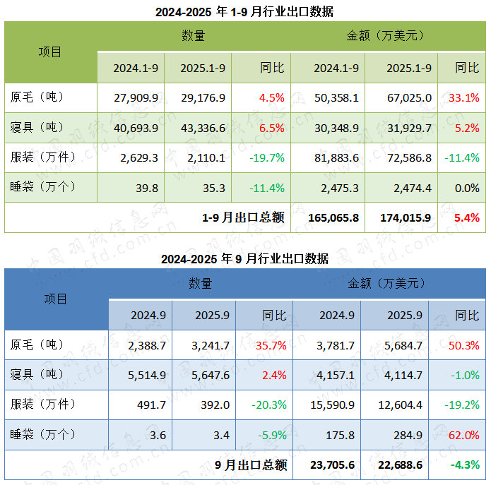 9月当月,羽绒行业出口总额约2.3亿美元,同比下降4.3%,降幅与8月相比缩窄1.5个百分点。从主要品类看,原毛出口表现亮眼,出口量值分别大幅上涨35.7%、50.3%。羽绒寝具出口基本与去年同期持平。羽绒服装出口量值同比均下滑约两成。