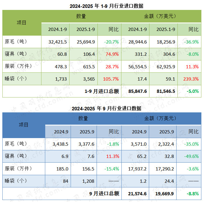 9月当月,行业进口总额约2.0亿美元,同比下滑8.8%。其中,原毛进口量基本与去年同期持平,但进口额大幅降低35.0%,进口平均单价下降33.8%。服装进口量值分别下滑15.4%、3.6%,进口平均单价上涨约14.0%。羽绒寝具进口量较少。