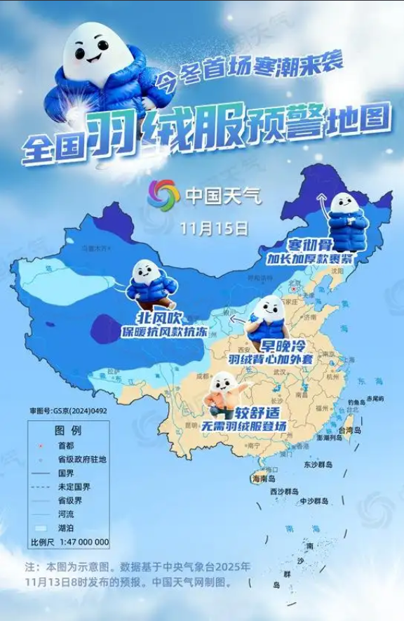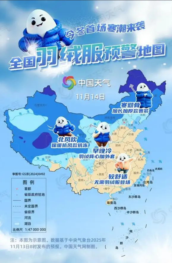 14日至15日,寒潮的影响区域主要集中在西北地区以及内蒙古等地,尤其是青藏高原北部、新疆北部、内蒙古东部等地,最高气温都将在冰点之下,一整天天寒地冻,需裹紧加长加厚款羽绒服。河北北部、甘肃、青海、川西高原等地区最高气温都将仅有个位数,部分地区大风相伴,需保暖抗风款。而长江以南地区还是一片暖意融融,羽绒服无需登场。