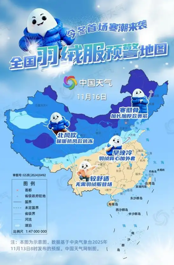 16日,随着寒潮主体东移南下,中东部气温将陆续转为偏低,或大范围创新低。天寒地冻的区域有所扩大,内蒙古中部、甘肃北部、山西北部、青海多地也需要加长加厚款羽绒服保暖。东北大部、宁夏、陕西大部、山西中南部、新疆大部、西藏等地最高气温仅有个位数,北京、天津、河北中北部北风劲吹,风寒效应明显,也需保暖抗风款羽绒服护体。大城市中,长春最高气温将跌至冰点之下,为今冬首次。