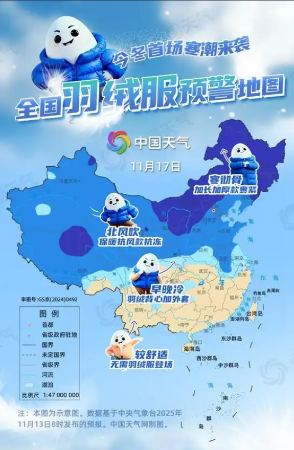这股冷空气属于干冷空气,但实力强劲、降温影响直抵华南。明起至下周初,我国中东部将开启一场大范围的气温跳水大赛,近30个省会、首府、直辖市气温将刷新今年下半年来新低,不少地区都需羽绒服护体。