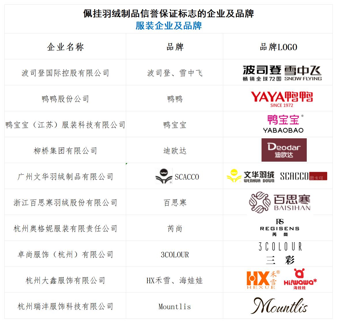 羽绒制品信誉保证标志佩挂企业及品牌(服装)