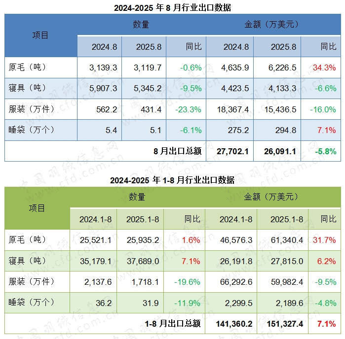 2025年1-8月,行业累计出口总额达15.1亿美元,同比增长7.1%,整体态势向好。原毛依然是最大亮点,出口额大幅增长31.7%,量价齐升趋势明显;寝具出口也保持稳健增长,量值分别增长7.1%和6.2%。然而,羽绒服装累计出口量和金额仍分别大幅下降19.6%和9.5%,表明成品服装出口面临较大挑战。但原毛和寝具的强劲增长,有效弥补了服装出口下滑造成的缺口,带动了整体出口的增长。
