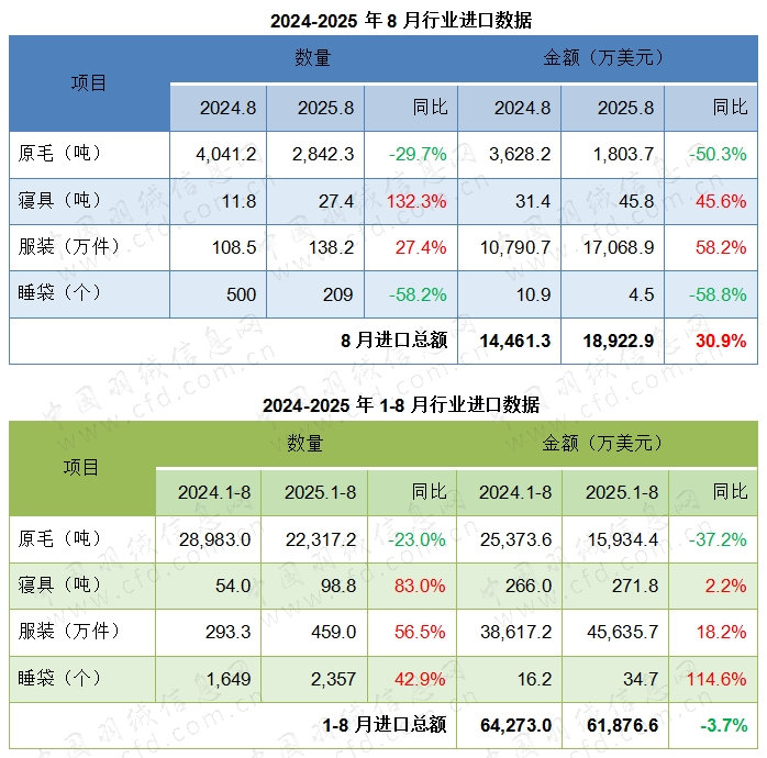 1-8月,行业累计进口总额为6.2亿美元,同比微降3.7%,整体保持稳定。与8月单月趋势类似,羽绒服装进口需求持续高涨,进口量和金额同比分别大幅增长56.5%和18.2%。原毛累计进口量和额则大幅下滑,分别下降23.0%和37.2%。
