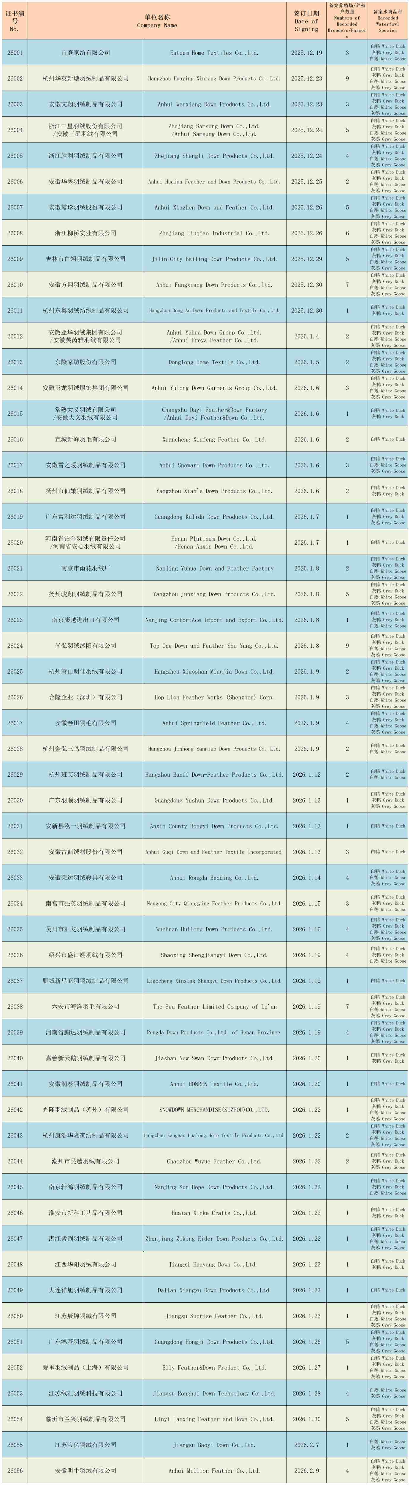 The Name List of 2026 Waterfowl Animal Welfare Commitment is showed as below. The name list will have regular update, and the latest update is made on Feb.9th,2026. Without CFDIA’s permission, any change or alter is prohibited. For any question, please contact with CFDIA.