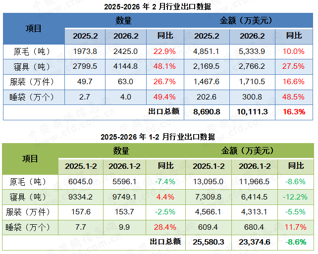 2026年2月,我国羽绒行业出口总额约1.0亿美元,与2025年同期相比上涨16.3%。其中,寝具出口增幅领跑,出口数量和金额同比分别增长48.1%、27.5%;原毛和服装均有不同程度涨幅,出口额同比分别增长10.0%、16.6%。原毛、寝具和服装出口金额涨幅均小于数量涨幅,出口平均单价均有所下调。