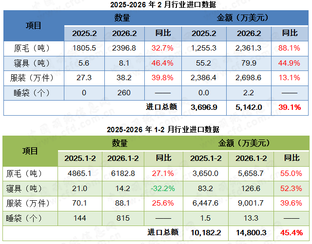 综合前两个月来看,行业进口总额约1.5亿美元,同比大幅上涨45.4%。原毛和服装进口量值齐增,其中,原毛进口金额同比上涨55.0%,服装进口额同比上涨39.6%。行业2025年10月开始的贸易逆差从2026年1月开始转为顺差,且2月贸易顺差从1月的3604.9万美元扩大至4969.3万美元。